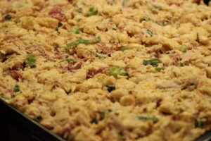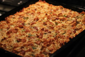 Stejně tak oberte maso z uvařených uzených žeber. Rohlíky nakrájejte na kostičky a smíchejte je se smetanou a máslovou šťávou z pečeného kuřátka. Přidejte kousky kuřete, uzenýho, nastrouhaný sýr, nakrájenou jarní cíbu, žloutky z vajec, mléko, sůl a pepř. Všechno pěkně promíchejte, a nakonec přidejte ušlehaný sníh z bílků. Pečte dozlatova v troubě předehřáté na 190 stupňů. Podávejte nejlíp s rajčatovým salátem. Nádivka je šťavnatá, voní máslem a děti vám za ní utrhnou ruce 🙂